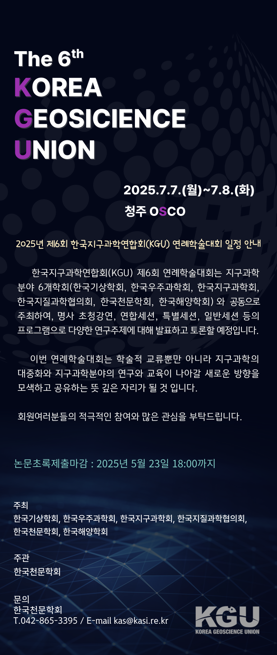 한국지구과학연합회(KGU) 제6회 연례학술대회는 지구과학분야 6개학회(한국기상학회, 한국우주과학회, 한국지구과학회, 한국지질과학협의회,한국천문학회, 한국해양학회)와 공동으로 주최하여, 명사 초청강연, 연합세션, 특별세션, 일반세션 등의 프로그램으로 다양한 연구주제에 대해 발표하고 토론할 예정입니다.
