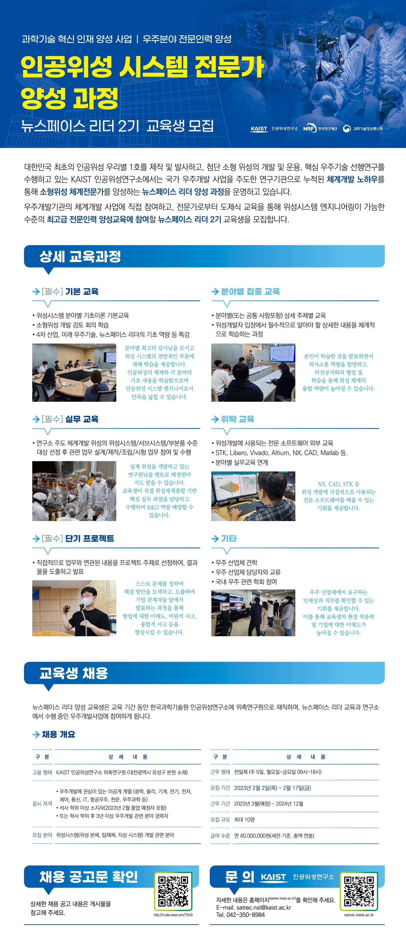 * 모집분야 : 위성시스템 전문가 양성 과정(뉴스페이스 리더 2기) 교육생