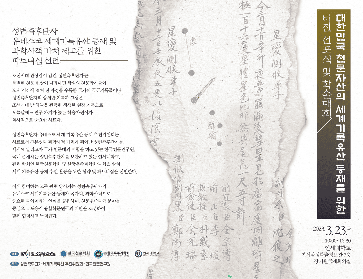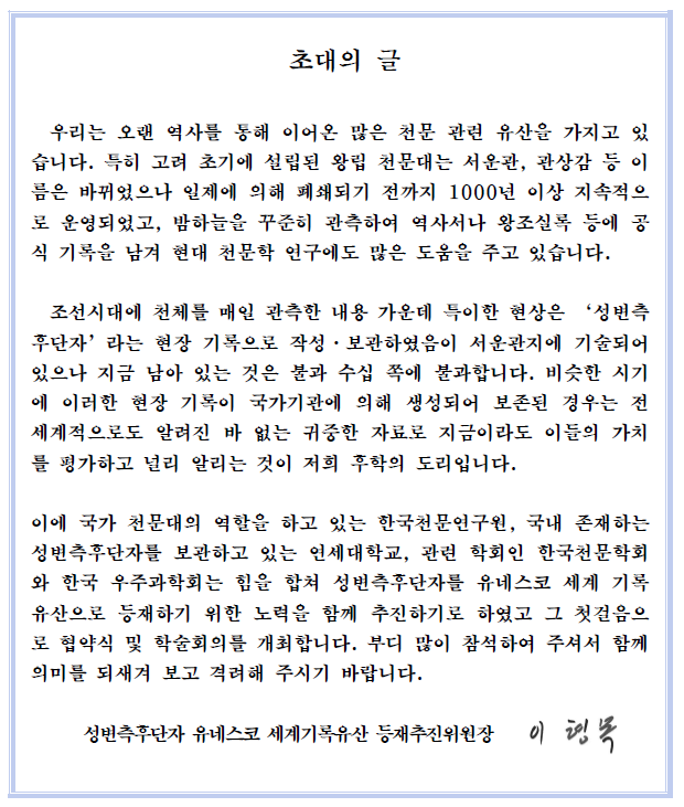 주제 : 대한민국 천문자산의 세계기록유산 등재를 위한 비전 선포식 및 학술대회