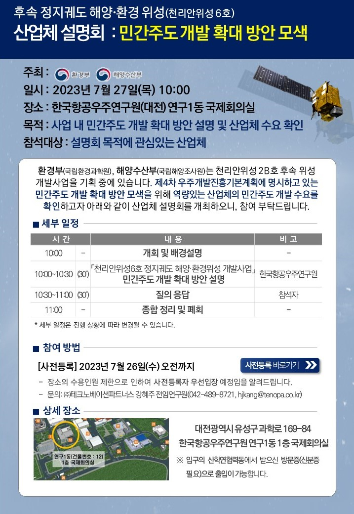 * 사전등록주소 : 후속 정지궤도 해양·환경위성(천리안위성 6호) 산업체설명회 사전등록