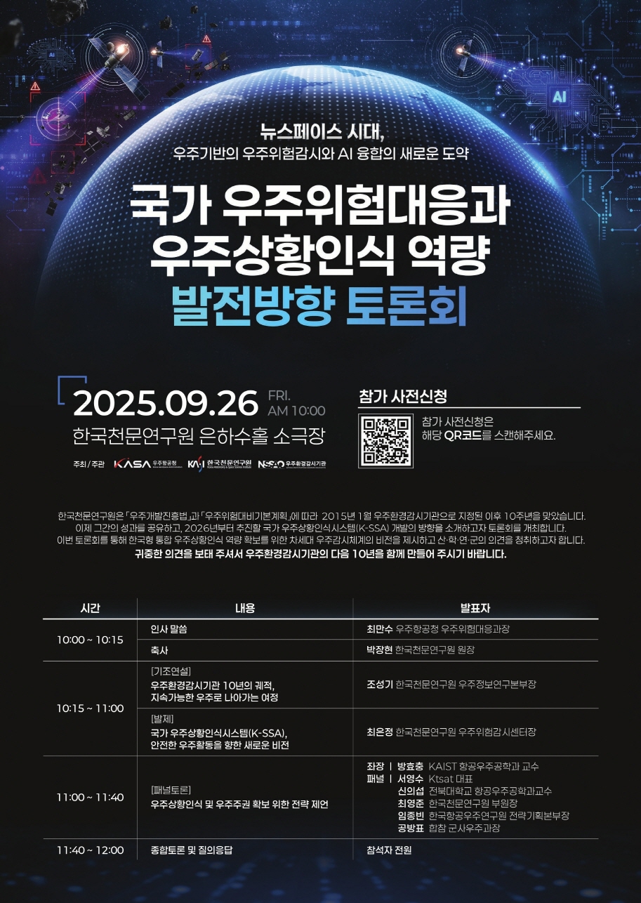 이제 그간의 성과를 공유하고, 2026년부터 추진할 R&D 사업인 국가 우주상황인식시스템(K-SSA) 개발의 방향을 소개하고자 토론회를 개최합니다.