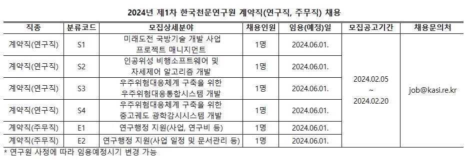 2024년 제1차 한국천문연구원 계약직(연구직, 주무직) 채용공고와 관련 링크입니다.