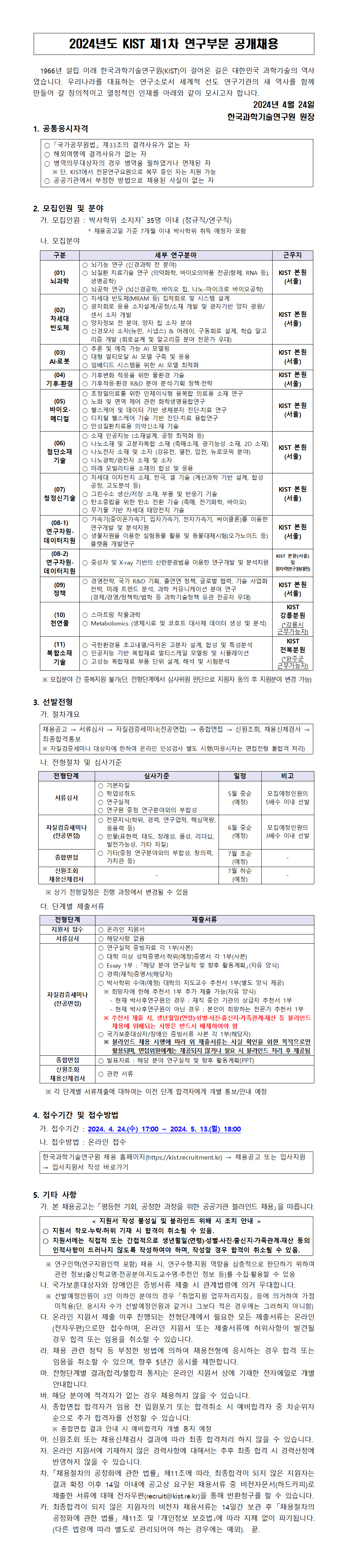 [한국과학기술연구원] 2024년도 KIST 제1차 연구부문 공개채용 안내(~5.13)