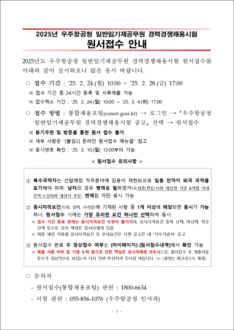[우주항공청] 2025년 일반임기제공무원 경력경쟁채용시험 공고
