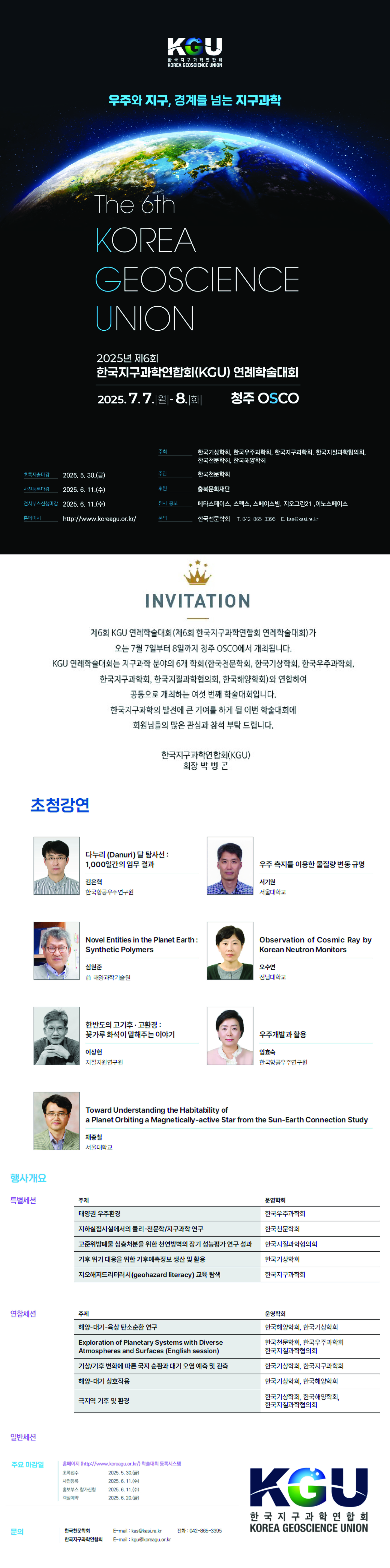 2025년 제6회 한국지구과학연합회(KGU) 연례학술대회가 오는 7월 7일(월)부터 8일(화)까지 청주 OSCO(https://www.osco.or.kr)에서 개최됩니다.